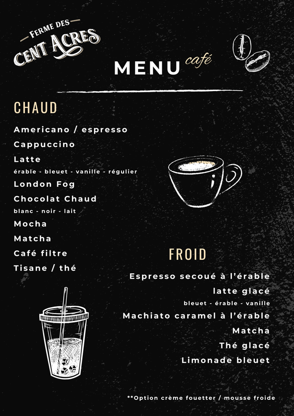 Vous y trouverez des produits locaux ainsi que des pâtisseries et de délicieux cafés tel le latte à l'érable et notre populaire café glacés.. à l'érable!